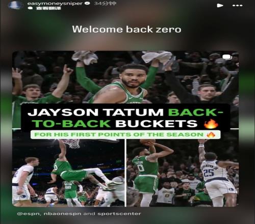 赛后,杜兰特转发塔图姆海报,并写道:“欢迎回来,0号。”