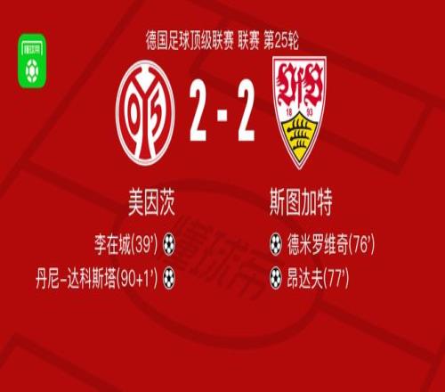 北京时间3月7日德国足球顶级联赛 联赛 第25轮,美因茨主场对阵斯图加特。美因茨李在城破门,丹尼-达科斯塔破门。斯图加特德米罗维奇破门,昂达夫破门。最终比分美因茨 2-2 斯图加特。