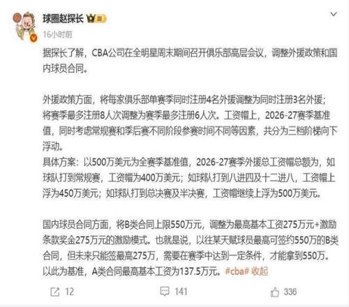 ¸ù¾ÝýÌåÈËËù½²£¬CBA¹«Ë¾ÔÚÈ«Ã÷ÐÇÈüÆÚ¼äÕÙ¿ª¸ß²ã»áÒ飬ÏÂÈü¼¾Ã¿Ö§Çò¶Ó×î¶à¿ÉÒÔͬʱע²á3ÃûÍâÔ®£¨±¾Èü¼¾Îª4Ãû£©£¬ÏÂÈü¼¾ÍâÔ®×¢²áÈ˴ε÷ÕûΪ6È˴Σ¨±¾Èü¼¾Îª8È˴Σ¬ÉÏÈü¼¾Ã»ÓÐÏÞÖÆ£©£»ÁíÍâ¹ØÓÚÍâÔ®¹¤×ÊñµÄÎÊÌ⣬ֻ´ò³£¹æÈüµÄÇò¶ÓÍâÔ®¹¤×ÊñÊÇ400ÍòÃÀÔª£¬´òµ½¼¾ºóÈü12Ç¿»òÕß8Ç¿µÄÇò¶Ó£¬ÍâÔ®¹¤×ÊñÊÇ450ÍòÃÀÔª£¬°ë¾öÈü£¨ËÄÇ¿£©µÄÇò¶ÓÍâÔ®¹¤×ÊñÊÇ500ÍòÃÀÔª¡£