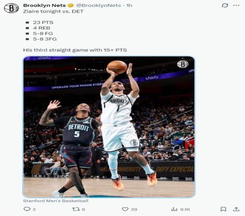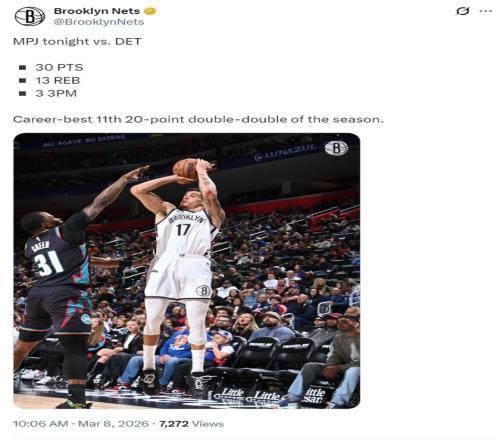 这场比赛小迈克尔-波特39分钟,25中10,三分12中3,罚球7中7,拿到30分13篮板1助攻2抢断1盖帽,他已经第11场比赛完成20+10的数据。