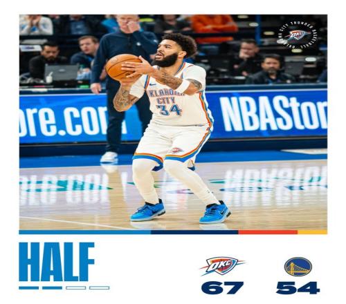 雷霆队的K-威廉姆斯上半场得到13分,亚历山大得到12分,乔得到10分;勇士队的桑托斯得到14分和6个篮板,波杰姆斯基得到10分。