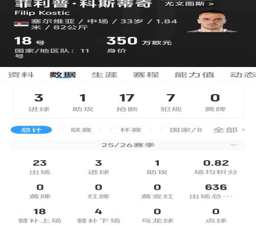 科斯蒂奇现年33岁,身价350万欧元,本赛季总共代表球队出场23次,贡献3粒进球和1次助攻。
