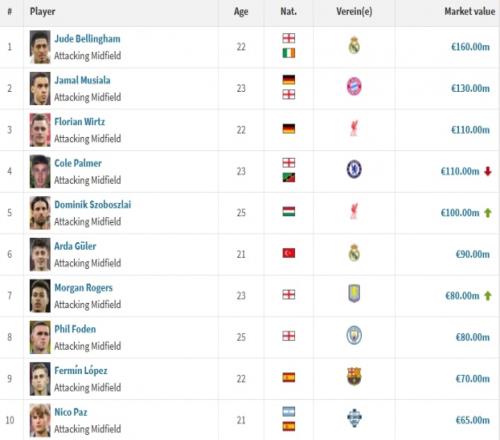 进攻型中场德转身价排名: