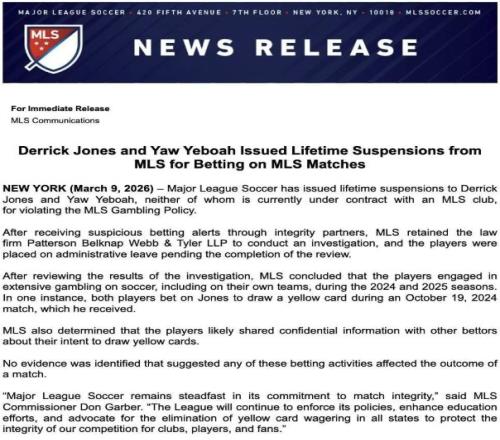据多家外媒报道,美国职业大联盟宣布,曾效力于美职联的两名球员德里克·琼斯和叶博亚因参与涉及美职联比赛的赌博活动被美职联处以终身禁赛。