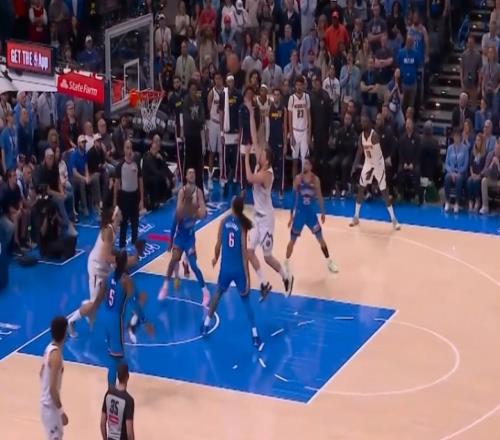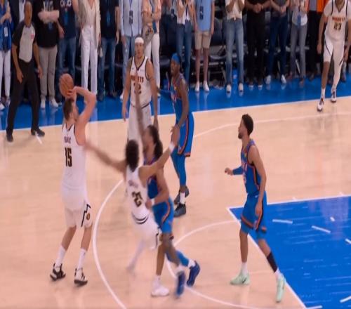 裁判吹罚约基奇三分有效,穆雷加罚一球;两人合力极限3+1追平比分。掘金126-126雷霆
