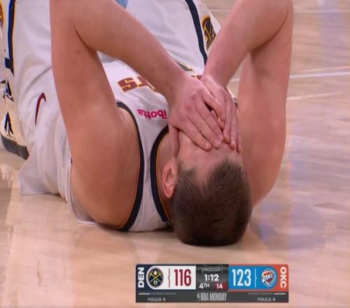 约基奇痛苦倒地,暂停回来后两罚一中。掘金117-123雷霆