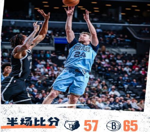次节比赛,篮网连续两节单节得分30+,且限制灰熊第二节本场首次单节不足30分。篮网多点开花逐步取得43-35领先优势,灰熊连追4分,篮网用团队攻势逐步扩大53-41领先优势。篮网继续扩大60-47领先优势,灰熊一波10-5攻势追分,篮网单节32-26净胜6分,上半场结束篮网65-57领先灰熊。前两节比赛,灰熊三分20中9,吕佩尔4记三分16分、韦尔斯12分与普洛斯珀11分;篮网三分13中7,特拉奥雷11分与夏普10分。