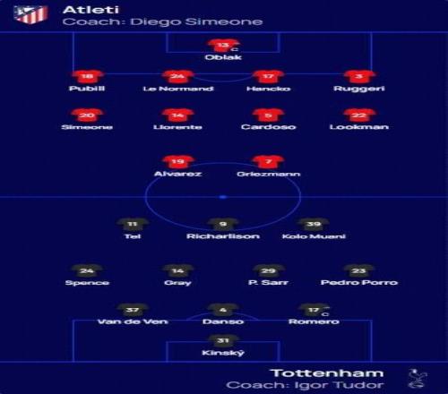 北京时间3月11日4:00,欧冠1/8决赛首回合,马德里竞技坐镇利雅得航空大都会球场迎战托特纳姆热刺,本场主裁判为格祖比尤克,赛前双方首发出炉。