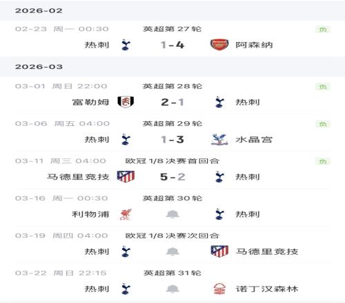 热刺欧冠1/8决赛首回合2-5惨败马竞,下周一周内将连续对阵利物浦、马竞(次回合)、森林。