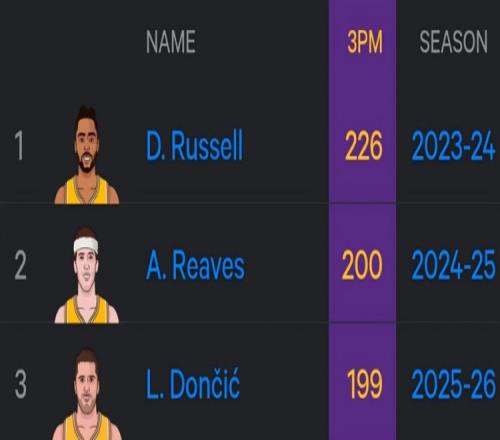 赛季至今,东契奇命中199记三分,队史单赛季第三多,距离拉塞尔保持的队史纪录还差27记。