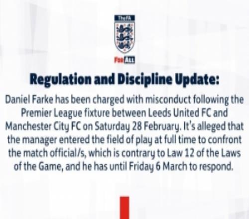 官方:英足总已指控利兹联主帅法尔克,他在对阵曼城赛后质询裁判