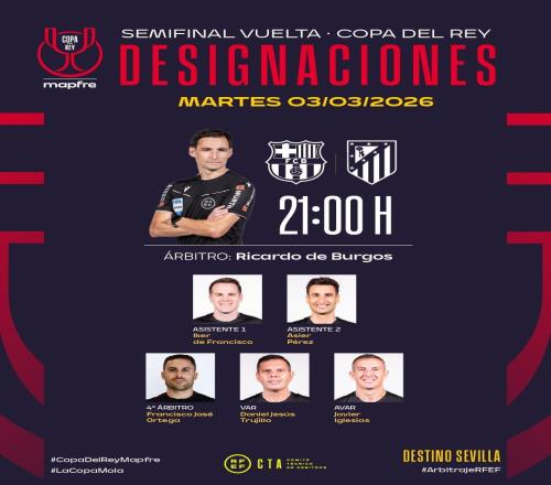 北京时间3月2日,西班牙足协官方公布了国王杯半决赛次回合,巴萨主场对阵马竞的裁判组名单,布尔戈斯担任主裁判。...