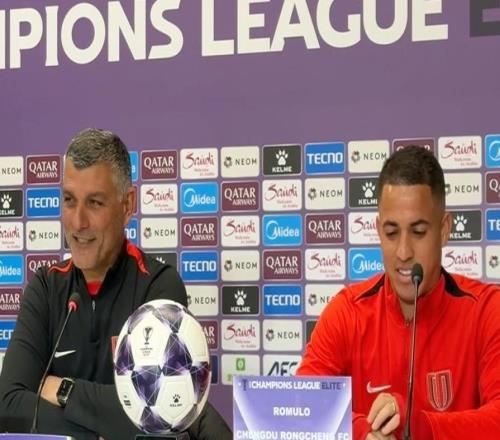 2月9日下午,成都蓉城与武里南联的赛前新闻发布会,主教练约翰-阿洛伊西和球员罗慕洛出席。约翰-阿洛伊西介绍备...