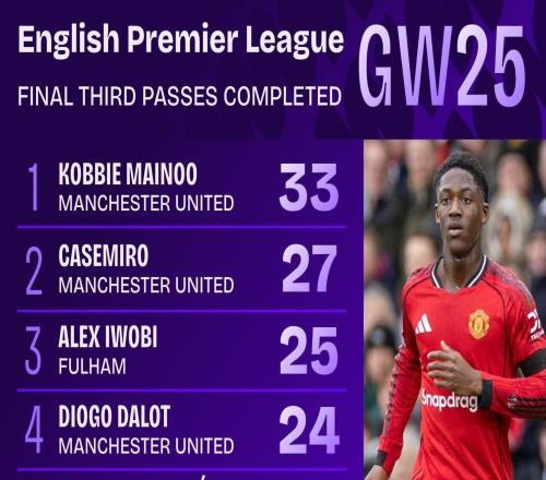 在曼联2-0战胜热刺的比赛中,曼联中场科比-梅努表现非常出色,其数据非常亮眼,33次进攻三区成功传球是本轮英超最...