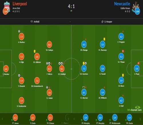 本场比赛纽卡在安菲尔德球场率先取得进球,但是没有顶住利物浦的反扑,眼睁睁看着埃基蒂克上演梅开二度,维尔茨和科纳特下半场分别建功,最终利物浦4-1逆转获胜,赛季双杀纽卡斯尔联队,此役送出一次助攻的萨拉赫,19次面对纽卡贡献10粒进球和10次助攻,成为了英超历史上唯一对阵单一对手进球和助攻全部上双的球员。