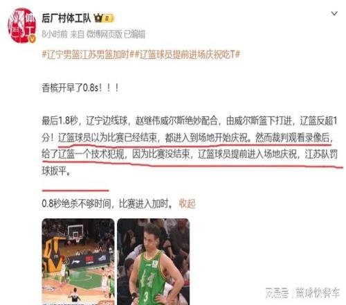 Íþ¶û˹½Óµ½ÕÔ¼ÌΰµÄ´«Çòºó£¬Ö±½Ó¿Õ½ÓÉÏÀºµÃÊÖ£¬ÁÉÄþ¶Ó80-79ÔÙ¶È·´³¬¡£´Ëʱ£¬Áô¸ø½ËÕ¶ÓֻʣÏÂ0.8Ãë¡£²»¹ý£¬ÔÚÍþ¶û˹ÃüÖÐÖ®ºó£¬ÁÉÄþ¶ÓÌæ²¹Ï¯È´ÎóÒÔΪ£¬È«³¡±ÈÈüÒѾ½áÊø£¬ËûÃÇÖ±½Ó³å½ø³¡ÄÚ£¬·è¿ñÇì×£¡£È»¶ø£¬²ÃÅÐͨ¹ýËæºóµÄ»Ø·ÅÈ·ÈÏ£¬±ÈÈü»¹Ê£ÏÂ0.8Ã룬ÕâÒ²¾ÍÒâζ×Å£¬ÕâÒ»³¡±ÈÈü»¹Ã»ÓнáÊø£¬¿ÉÁÉÄþ¶ÓÌæ²¹ÇòԱȴ³å½ø³¡ÄÚ£¬Ëæ¼´²ÃÅиøÁËÁÉÄþ¶ÓÒ»¸ö¼¼Êõ·¸¹æ¡£½ËÕ¶Óͨ¹ýÕâÒ»´Î¼¼Êõ·¸¹æ£¬·£ÇòÃüÖУ¬ÔÙ¶ÈËÀÀïÌÓÉú£¬Ë«·½Õ½³É80-80ƽÊÖ£¬½øÈëµ½¼ÓʱÈü¡£