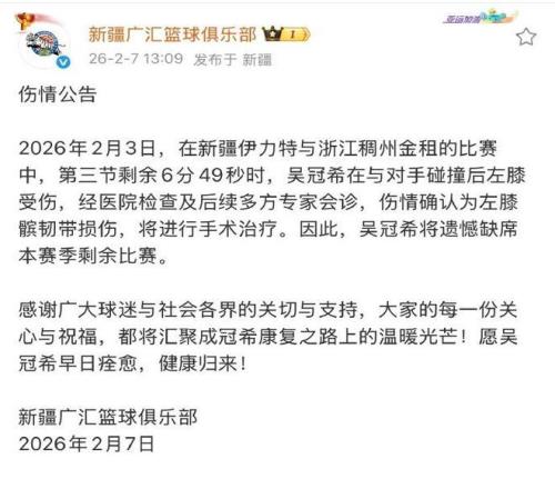 н®ÄÐÀº¹Ù·½É˲¡¹«¸æÐ´µÀ£º¡°2026Äê2ÔÂ3ÈÕ£¬ÔÚн®ÄÐÀºÓëÕã½ÄÐÀºµÄ±ÈÈüÖУ¬µÚÈý½ÚÊ£Óà6·Ö49Ãëʱ£¬Îâ¹ÚÏ£ÔÚÓë¶ÔÊÖÅöײºó×óÏ¥ÊÜÉË¡£¾Ò½Ôº¼ì²é¼°ºóÐø¶à·½×¨¼Ò»áÕÉËÇéÈ·ÈÏΪ×óÏ¥÷ÆÈÍ´øËðÉË£¬½«½øÐÐÊÖÊõÖÎÁÆ£¬Òò´ËÎâ¹ÚÏ£½«Òź¶È±Ï¯±¾Èü¼¾Ê£Óà±ÈÈü¡£¡±