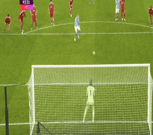 第93分钟,哈兰德操刀主罚,骗过阿利松,将球打进,曼城反超比分。