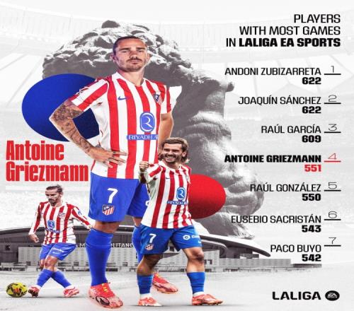 此役过后,格列兹曼已经在西甲出战551场比赛(204球97助),成为西甲历史出场第四多的球员。