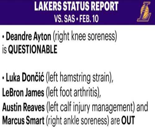 湖人首发5人仅剩顿宝,右膝酸痛出战成疑。