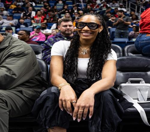 鹈鹕官推晒出了WNBA王牌队巨星阿贾·威尔逊场边看球的照片。她应该是来支持自己的男友,热火中锋阿德巴约。