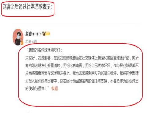 ºóÀ´£¬ÕÔî£Ò²ÊǾʹËʽøÐÐÁ˵ÀǸ£¬±íʾ×Ô¼ºµ±Ê±ÊÇÇéÐ÷»¯µØ»ØÓ¦ÁËÇòÃÔµÄÆÀÂÛ£¬ºÜ²»Ó¦¸Ã£¬Òò´Ë£¬ÌرðÏòÇòÃÔ½øÐеÀǸ¡£Óë´Ëͬʱ£¬ÕÔ¹±íʾ×Ô¼º×÷Ϊһ¸öÖ°ÒµÀºÇòÔ˶¯Ô±£¬¾ÍÓ¦¸Ã¿ØÖƺÃ×Ô¼ºµÄÇéÐ÷£¬²»¹ÜÔÚʲôʱºò£¬¶¼²»Ó¦¸Ã½«×Ô¼ºµÄÇéÐ÷·¢Ð¹µ½ÇòÃÔÉíÉÏ¡£ÔÚδÀ´£¬×Ô¼º¿Ï¶¨»áרעÓÚѵÁ·£¬×¨×¢ÓÚ±ÈÈü¡£Í¬Ê±£¬Ò²ÊǽÓÊÜ´ó¼ÒµÄ¼à¶½ºÍÅúÆÀ¡£