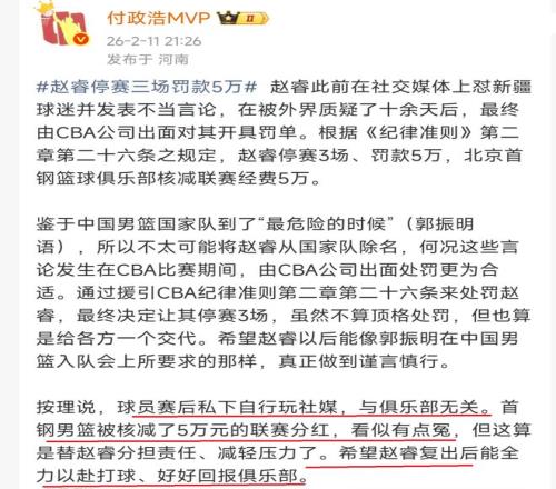 CBAÃû¼Ç¸¶ÕþºÆ£¬Ì¸µ½ÕÔ»·£¿î£¬±»Í£Èü֮ʣ¬ËûÈÏΪÕÔî£×Ô¼ºÍæÉçý£¬Óë¾ãÀÖ²¿Î޹أ¬Óë±±¾©¶ÓÎ޹أ¬Òò´Ë£¬±±¾©¶Ó±»·£¿î£¬ÓÐÒ»µãÔ©ÁË¡¡