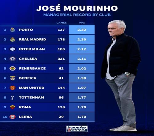德国转会市场统计了穆里尼奥执教生涯至今在不同球队的场均积分,并列出榜单,波尔图2.32分居首,皇马2.3分次席。