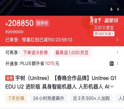 宇树科技春晚同款机器人已上架:售价208850元,支持送货上门