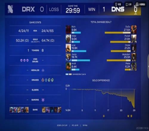 26·ÖÖÓ£¬DRXÔÚÒ°ÇøÇ¿É±À¼²©Ê§°Ü£¬±»DNS´ò³ö0»»4Ö®ºóÊÕÏÂË®Áú»ê+´óÁú£¡ËæºóÉÏ·DRXÏëÇ¿¶¯deokdam½ýµ«ÊDZ»DuDuÀ¼²©ÉÁÏÖ»ð¿¾+´øÇòÈ볡¾íÁËÈý¸ö˲¼äɱËÀ±ÈÈü£¬DNSÍÅÃðDRX£¬´ÓÉÏ·һ²¨½áÊøÊ×¾Ö£¡