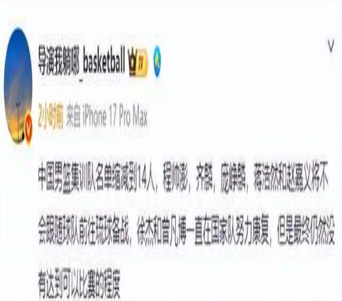第二窗口期世预赛备战已经进入最后冲刺阶段,中国男篮将在客场先后对阵日本男篮和中国台北,这两场比赛对于中国男篮来说都非常重要,关系到中国男篮能否小组出线。据悉,中国男篮将于明日从上海直飞日本冲绳,具体出战大名单也会随之公布。媒体人“导演我躺哪”已经透露了代表中国男篮出战这个窗口期世预赛的大名单,郭士强选择带14名球员出战,徐杰和曾凡博因伤无缘,程帅澎,齐麟,庞峥麟,蒋浩然和赵嘉义将不会跟随球队前往琉球备战,这样一来,总共有14名球员入选最终大名单,分别是赵睿、胡明轩、赵继伟、高诗岩、廖三宁、贺希宁、王浩然、余嘉豪、胡金秋、朱俊龙、张镇麟、焦泊乔、李弘权、徐昕。