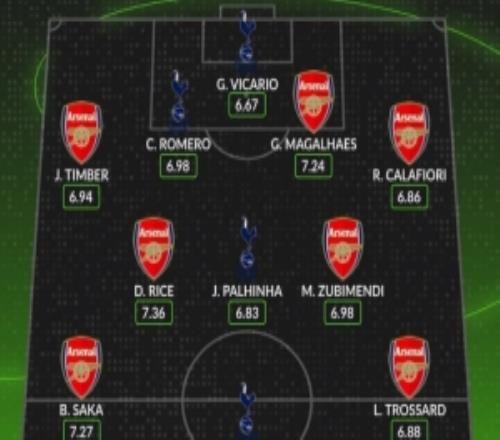 本赛季阿森纳+热刺评分最高阵:赖斯领衔阿森纳7人,罗梅罗在列