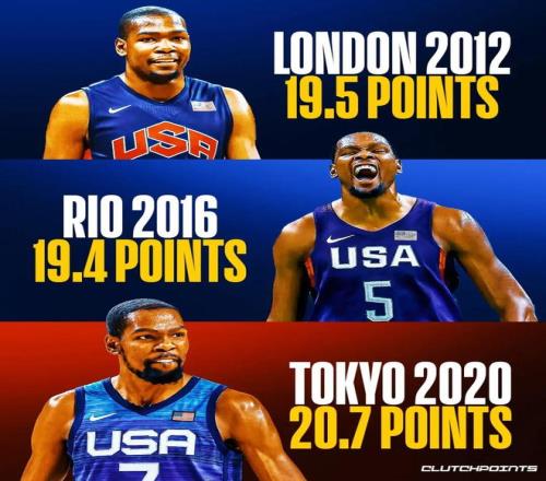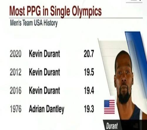 值得注意的是,美国男篮奥运历史上,单届场均得分前三的都是杜兰特(分别就是杜兰特的前三次奥运会之旅),他的得分能力有多么突出足以见得。