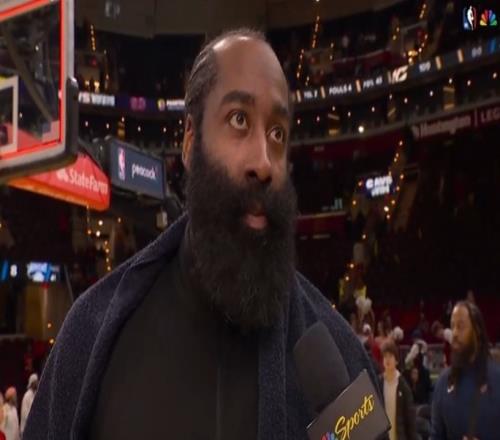 体育播报2月25日宣 NBA常规赛,骑士109-94大胜尼克斯,本赛季首胜尼克斯,哈登赛后在场边接受了媒体采访。