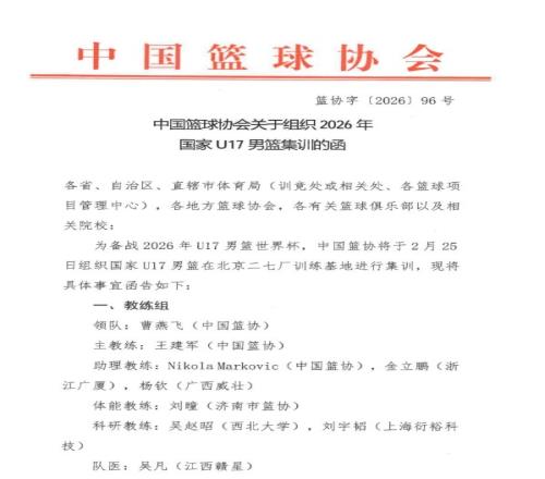 体育播报2月25日宣 中国篮协公布了中国U17男篮的集训名单。