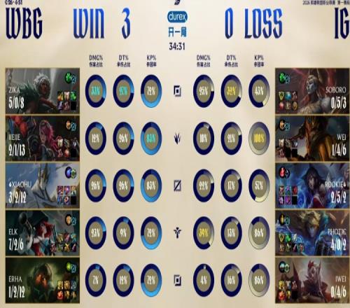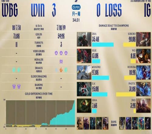 22分钟Photic的EZ中路装逼吃到安蓓萨大招被迫交闪,Wei皇子反手盖大但是进场的Soboro亚恒没了!Rookie阿狸眼上绕后直接吃到Jiejie蔚锁头送了!Wei皇子残局想坐先锋跑结果人和车都没了!iG这波送了波大的,被WBG打出0换4之后拿下大龙拉开经济差!随后WBG没让iG拿下龙魂,分拆掉三路高地之后一波结束比赛,横扫iG晋级胜者组第二轮!
