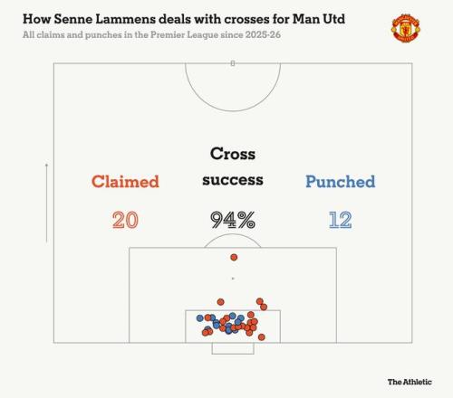 全场数据显示,埃弗顿拿到10个角球,曼联仅有1个;对手尝试35次传中,完成5次。拉门斯干净摘下2次高空球,4次拳击球解围——这6次关键处理,在本赛季英超单场数据中并列第四,更难得的是,全部来自小禁区内。