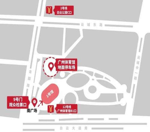 ¹ãÖݵØÌú2ºÅÏߣº´Ó°×ÔÆ¹«Ô°Õ¾Ï³µ£¬C³ö¿Ú³öÕ¾ºóÍù¶«Ç°ÐÐ300Ã×¼´µ½´ï³¡¹Ý£»