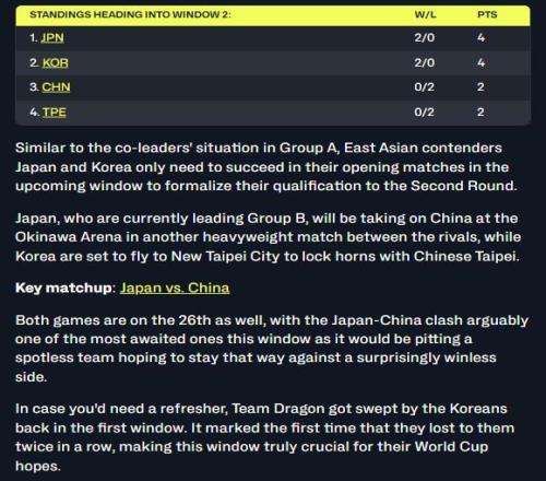 ĿǰÔÝ¾Ó B ×é°ñÊ×µÄÈÕ±¾¶Ó£¬½«ÓÚ³åÉþ¾º¼¼³¡ÓëÖйú¶ÓÕ¹¿ªÁíÒ»³¡ÖØÁ¿¼¶¶Ô¾ö¡£Óë´Ëͬʱ£¬º«¹ú¶ÓÔò×¼±¸·ÉµÖб±ÊУ¬ÓëÖйų́±±¶ÓÒ»¾ö¸ßÏ¡£