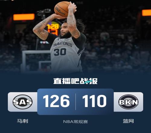 马刺(43-16):尚帕尼26分2板2助3断2帽、卡斯尔18分2板5助2断、瓦塞尔14分7板5助、福克斯14分1板6助2断、凯尔登13分4板、文班亚马12分8板5助2断2帽、哈珀12分3板7助、科内特6分7板2助、沃特斯6分、巴恩斯3分1助、麦克劳林2分2板1助、布莱恩特3板2助