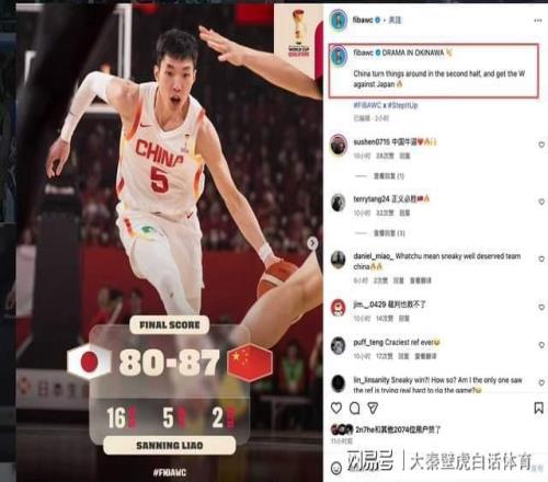 国际篮联社媒赛后晒出战报海报,将本场立下汗马功劳的中国球员廖三宁登上封面,然而F配文上却是: