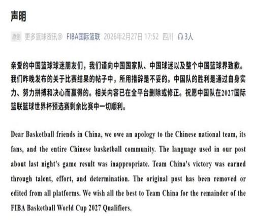 2ÔÂ27ÈÕ£¬¹ú¼ÊÀºÁªÖÕÓÚÕýʽ·¢Éù£¬ÏòÖйú¹ú¼Ò¶Ó¡¢ÖйúÇòÃÔÒÔ¼°Õû¸öÖйúÀºÇò½ç±í´ïǸÒâ¡£ÉùÃ÷ÖÐÃ÷È·±íʾ£¬´Ëǰ·¢²¼µÄ¹ØÓÚ±ÈÈü½á¹ûµÄÌû×ÓËùÓôë´Ç²»Í×£¬Ç¿µ÷Öйú¶ÓµÄʤÀûÊÇͨ¹ý×ÔÉíʵÁ¦¡¢Å¬Á¦Æ´²«ºÍ¾öÐÄÓ®µÃµÄ£¬Ïà¹ØÕùÒéÄÚÈÝÒÑÔÚȫƽ̨ɾ³ý»òÐÞÕý£¬Í¬Ê±×£Ô¸Öйú¶ÓÔÚ2027¹ú¼ÊÀºÁªÀºÇòÊÀ½ç±Ô¤Ñ¡ÈüÊ£Óà±ÈÈüÖÐÒ»ÇÐ˳Àû¡£Õâ·ÝµÀǸÉùÃ÷ÖÕÓÚ»ØÓ¦Á˹«ÖÚµÄËßÇó£¬Ò²ÔÝʱƽϢÁËÒò´ë´Ç²»µ±Òý·¢µÄÓßÂ۷粨£¬µ«´Ë´ÎʼþÁôϵÄÓ°ÏìÈÔÔÚ³ÖÐø£¬²»ÉÙÇòÃÔÏ£Íû¹ú¼ÊÀºÁªÄÜÕæÕý±ü³Ö¹«Æ½¹«ÕýµÄÔÔò£¬ÔÚºóÐøÈüÊÂÖй淶×ÔÉíÐÐΪ£¬×ðÖØÃ¿Ò»Ö§Çò¶ÓµÄŬÁ¦¡£