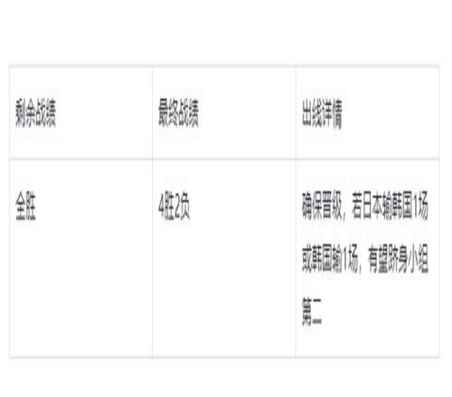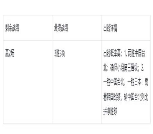 Öйú¶ÓµÄ1ʤÈôÓ®ÔÚÖйų́±±ÄÐÀºÉíÉÏ£¬ÈÕ±¾ÄÐÀºÔò»áÖÁÉÙ3ʤ½ú¼¶£¬Öйú¶ÓÏëÒª½ú¼¶¾Í±ØÐëÂú×ãÖйų́±±ÄÐÀºÊ£ÓàÁ½³¡È«Ê䣨º«¹úÒ²ÄÜ3ʤ½ú¼¶£©£¬ÇÒ¾»Ê¤·ÖСÓÚÖйú¶Ó¡£