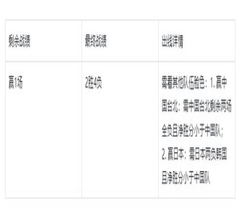 Öйú¶ÓµÄ1ʤÈôÓ®ÔÚÈÕ±¾ÄÐÀºÉíÉÏ£¨Á½¸ºÖйų́±±¶Ó£©£¬Öйų́±±ÄÐÀºÔòÄÜ3ʤ½ú¼¶£¬Öйú¶ÓÏë½ú¼¶¾Í±ØÐëÂú×ãÈÕ±¾¶ÓÁ½¸ºº«¹úÄÐÀº£¨º«¹ú4ʤ½ú¼¶£©£¬Í¬Ê±¾»Ê¤·ÖСÓÚÖйú¶Ó¡£