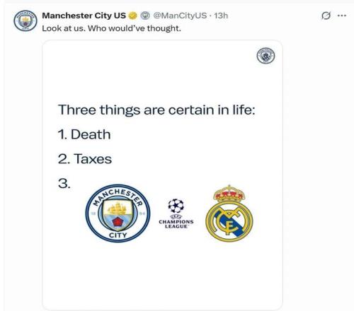 ±±¾©Ê±¼ä2ÔÂ28ÈÕÁ賿£¬¹Ù·½É罻ýÌå·¢ÎÄɹ³öÁËÒ»ÕÅͼƬ£¬²¢ÅäÒÔ¡°¿´¿´ÎÒÃÇ£¬ËÄÜÏëµ½ÄØ¡±µÄÎÄ×Ö¡£¶øÍ¼Æ¬ÖÐÔòдµÀ£º¡°ÈËÉúÖÐÓÐÈý¼þÊÂÊÇ×¢¶¨µÄ£¬1¡¢ËÀÍö£»2¡¢Ë°ÊÕ£»3¡¢Âü³Çvs»ÊÂí¡±¡£