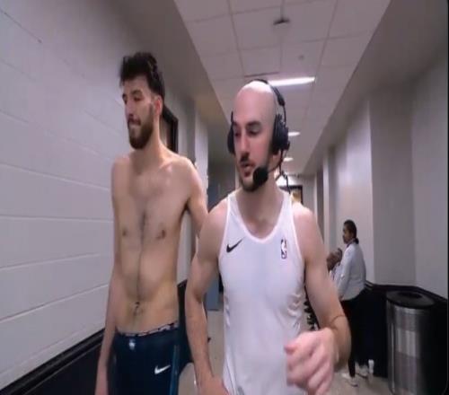 虽瘦但能抢板!卡鲁索赛后接受采访时切特经过半裸排骨吸引眼球