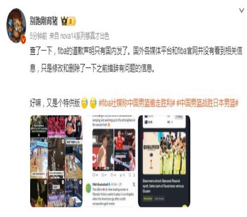 FIBA随后修改争议帖子,并将文案修改为“中国男篮下半场翻盘,击败日本男篮”,但最初并未公开道歉。