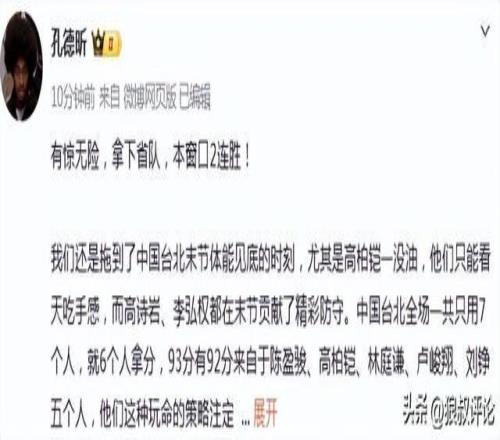 北京时间3月1日,男篮世预赛窗口期,中国男篮100-93击败中国台北男篮,取得了世预赛的两连胜。