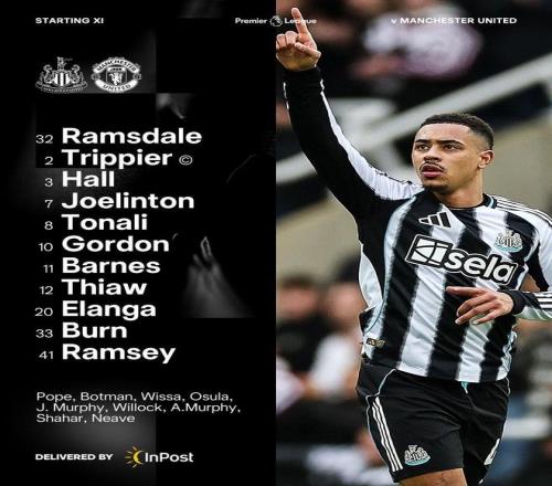 纽卡斯尔联首发:32-拉姆斯代尔、2-特里皮尔、33-丹-伯恩、12-马利克-佳夫、3-刘易斯-霍尔、7-乔林顿、8-托纳利、41-雅各布-拉姆齐、10-安东尼-戈登、11-哈维-巴恩斯、20-埃兰加