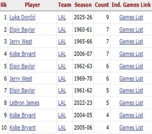 东契奇得到44分9篮板5助攻,这让他单赛季40+5+5的次数(10次)位列湖人队史第一。